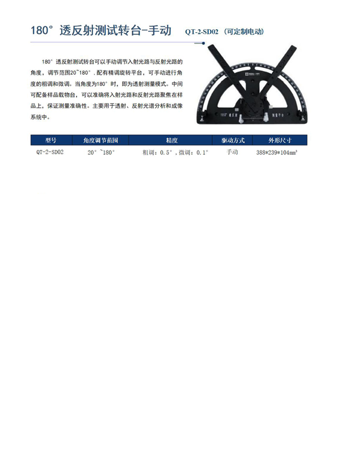 180°透反射測試轉(zhuǎn)臺可以手動調(diào)節(jié)入射光路與反射光路的角度,調(diào)節(jié)范圍20~180°,配有精調(diào)旋轉(zhuǎn)平臺,可手動進(jìn)行角度的粗調(diào)和微調(diào)。當(dāng)角度為180°時,即為透射測量模式。中間可配備樣品載物臺,可以準(zhǔn)確將入射光路和反射光路聚焦在樣品上,保證測量準(zhǔn)確性。主要用于透射、反射光譜分析和成像系統(tǒng)中。
