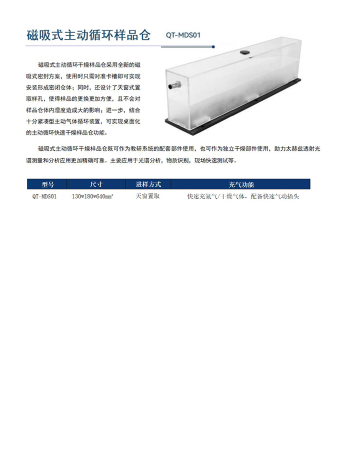 磁吸式主動(dòng)循環(huán)干燥樣品倉(cāng)既可作為教研系統(tǒng)的配套部件使用,也可作為獨(dú)立干燥部件使用,助力太赫茲透射光譜測(cè)量和分析應(yīng)用更加精確可靠。主要應(yīng)用于光譜分析,物質(zhì)識(shí)別,現(xiàn)場(chǎng)快速測(cè)試等。