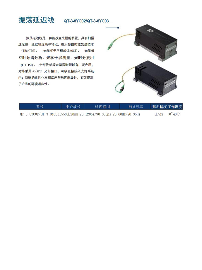 振蕩延遲線是一種能改變光程的裝置,具有掃描速度快、延遲精度高等特點,在太赫茲時域光譜技術(THz-TDS)、光學相干層析成像(OCT)、光學傅立葉頻譜分析、光學干涉測量、光時分復用(OTDM) 、光纖傳感等光學探測領域有廣泛應用; 對外采用FC/APC光纖接口,可以直接接入光纖系統(tǒng)內(nèi);特殊的柔性化支撐底座與熱匹配設計,有效提高了產(chǎn)品的環(huán)境適應性。